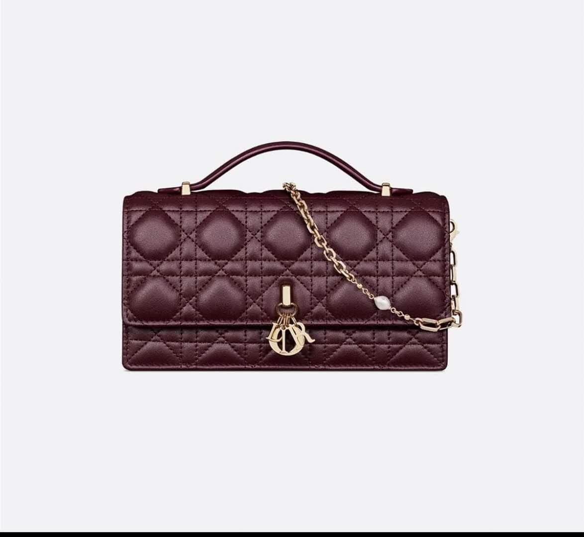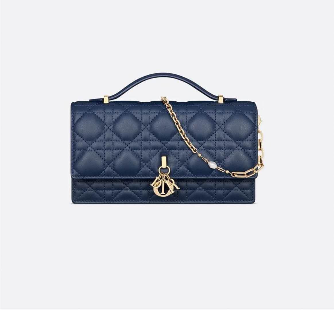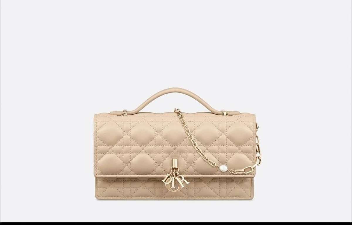The new My Dior bag for Winter 2025, with its chain strap, expands the collection with a practical and compact hybrid design. Crafted from black lambskin with Cannage stitching, it features a flap adorned with faded gold D.I.O.R. hardware. Its interior includes two removable pockets, one with six card slots for all your essentials. Equipped with a detachable beaded chain strap, it can be carried elegantly by hand, over the shoulder, or across the body.
